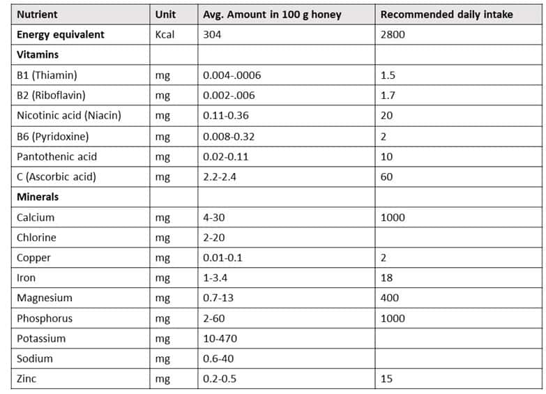 Different unifloral honeys contain different amounts of minerals according to the source of the nectar. However, the levels of vitamins and minerals in honey are so minimal that they make only a small contribution to the recommended daily intake (RDI) ( see the table below).
